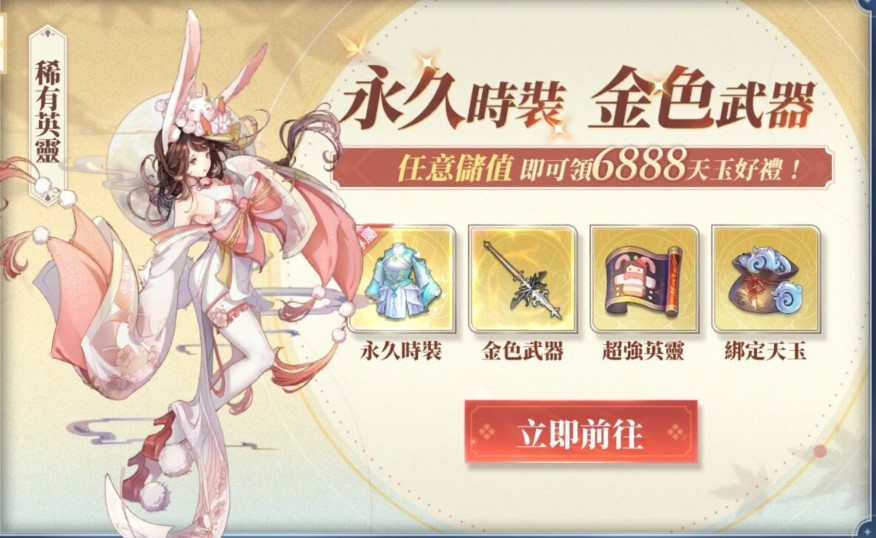 新冒險家享超值迎新禮,首次儲值即可領取永久時裝、金色武器、超稀有英靈賽花、綁定天玉藏寶袋。