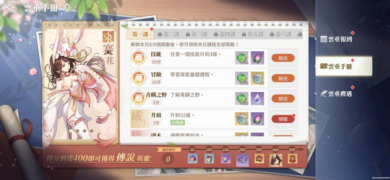 根據諭圓的指引逐步融入雲垂,完成每日目標可領取永久外觀、綁定天玉、紫色神格精華等豐富獎勵,學分達到500還可領取傳說英靈【賽花】!